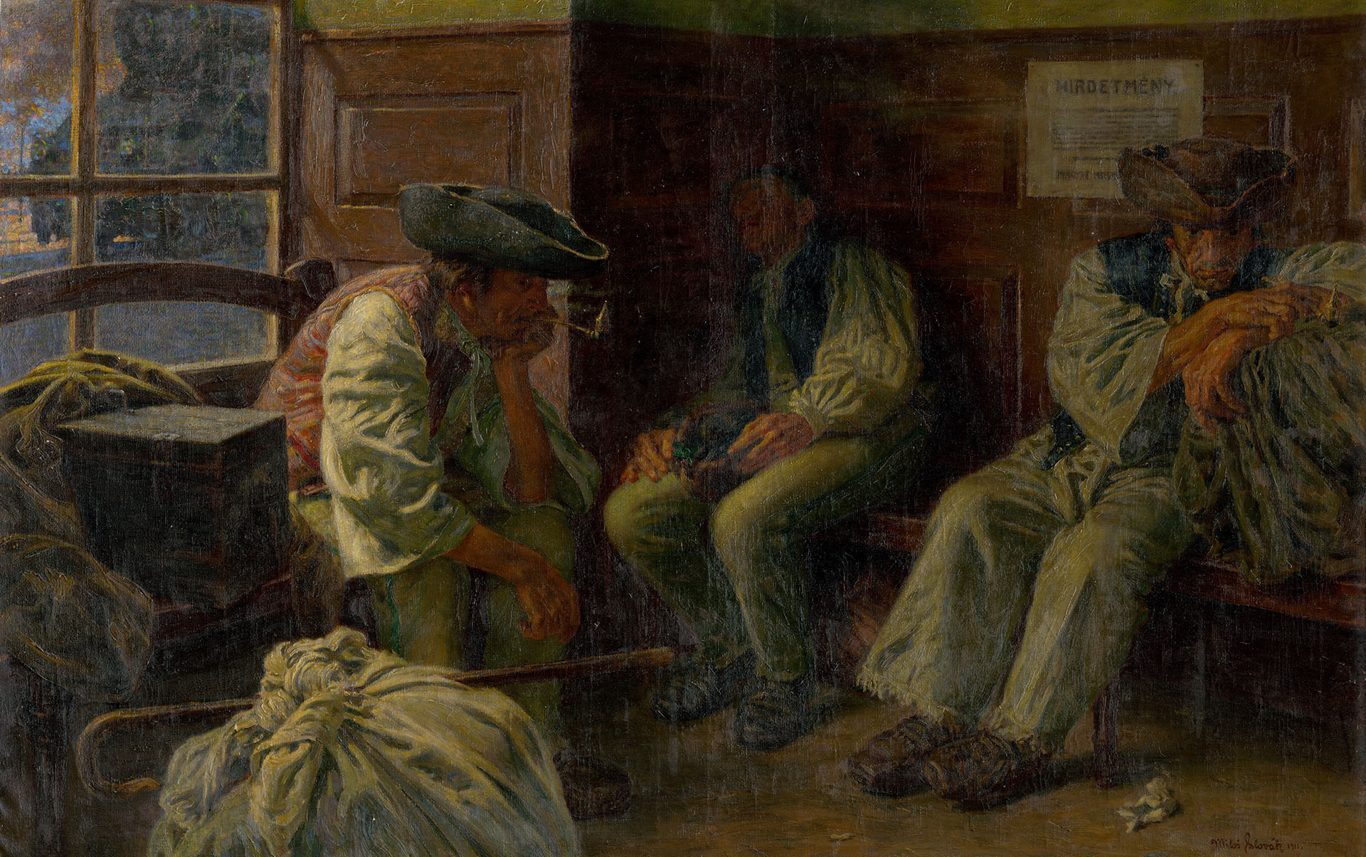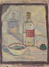 Navonok vidíme štyri postavy sediace vedľa seba. V strede leží jednoduchý predmet – fľaša, nenápadný stredobod scény, ktorý odkazuje na názov diela: Raňajky. O čom asi postavy premýšľajú?