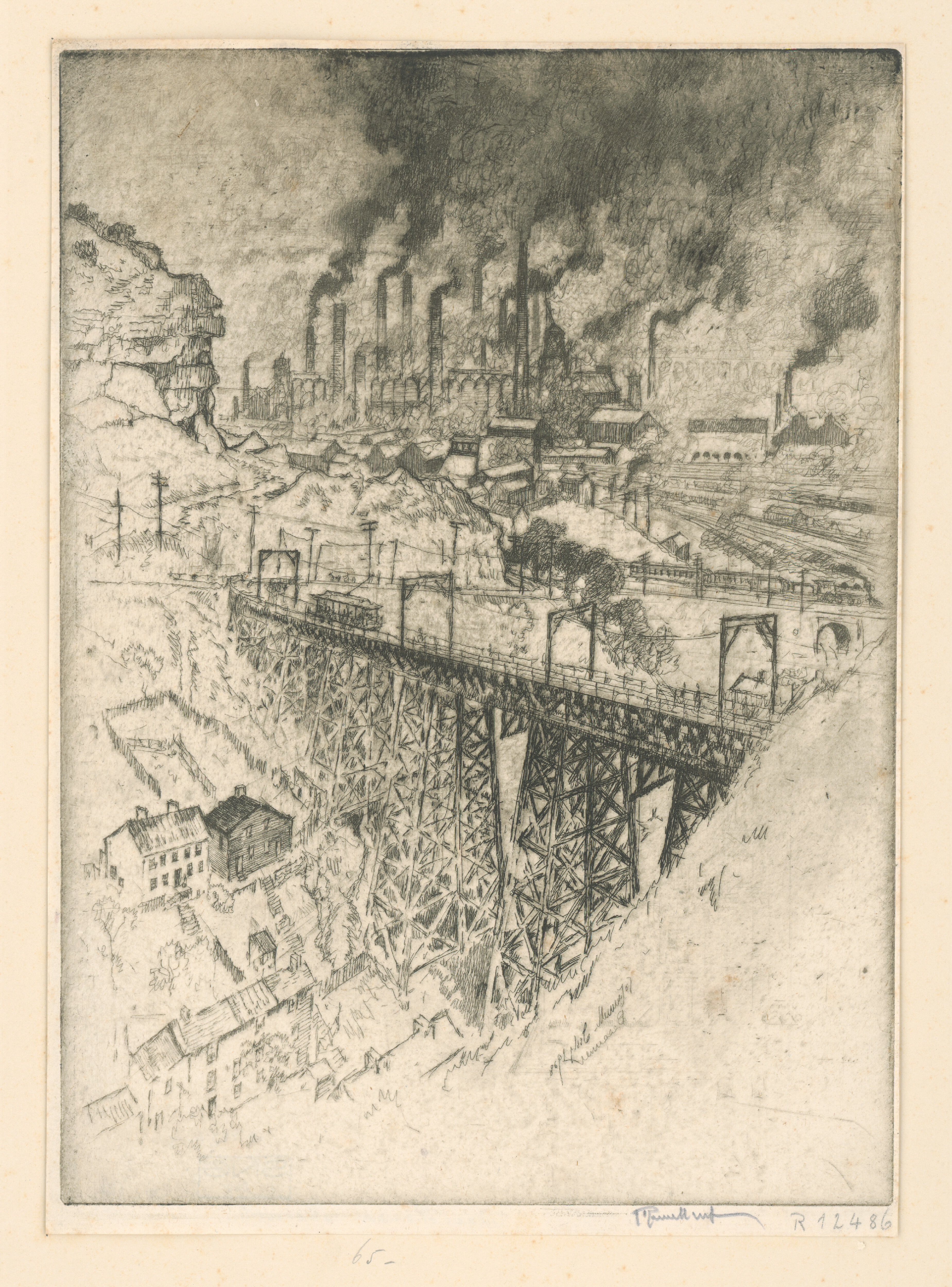 tagy: továreň komín dym most železnica