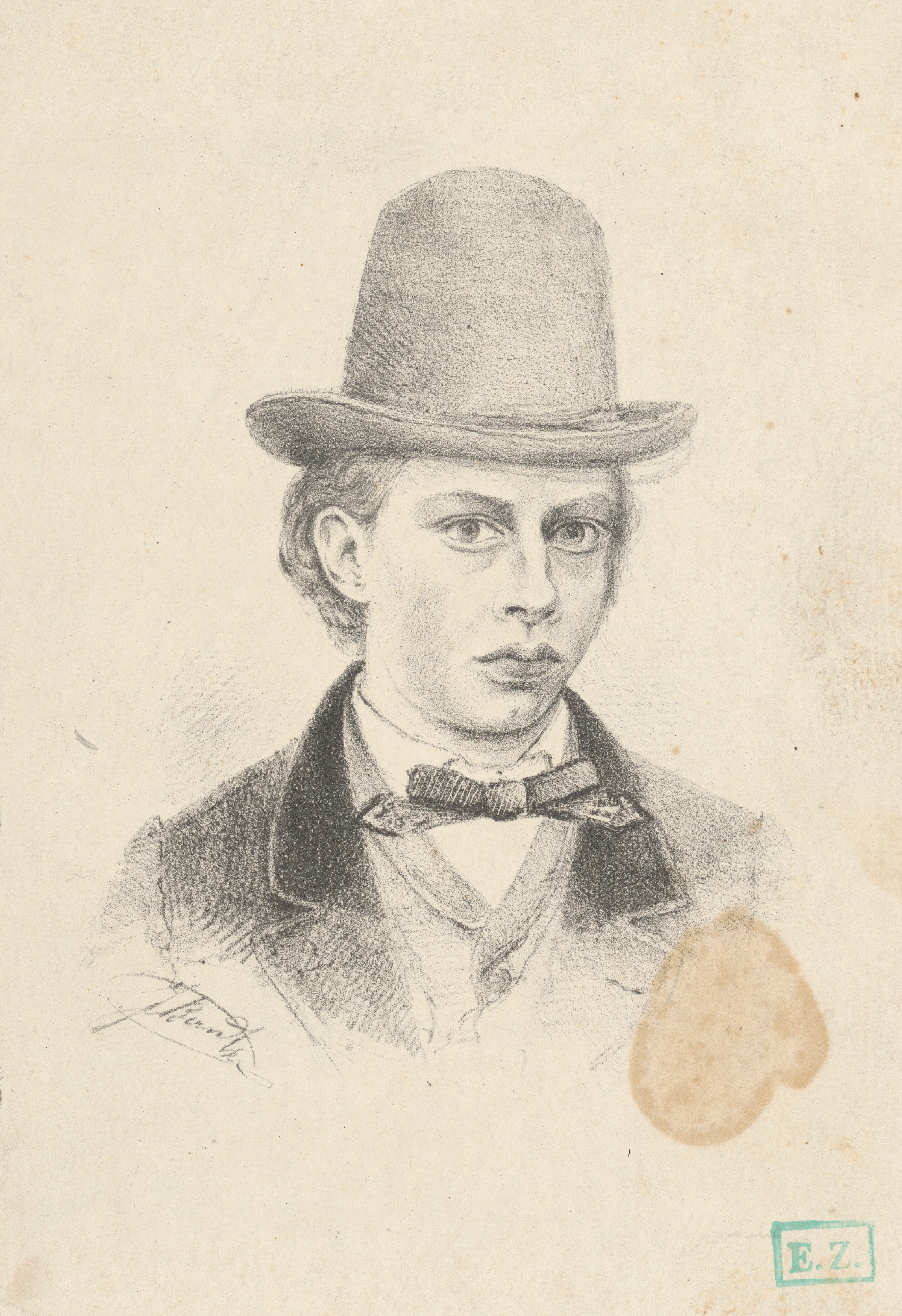 J. Bernhard – Portrét mladého muža v klobúku (Mladík vo vysokom klobúku), 19. storočie, polovica, okolo 1850, Galéria umenia Ernesta Zmetáka, GNZ, https://www.webumenia.sk/dielo/SVK:GNZ.G_1224