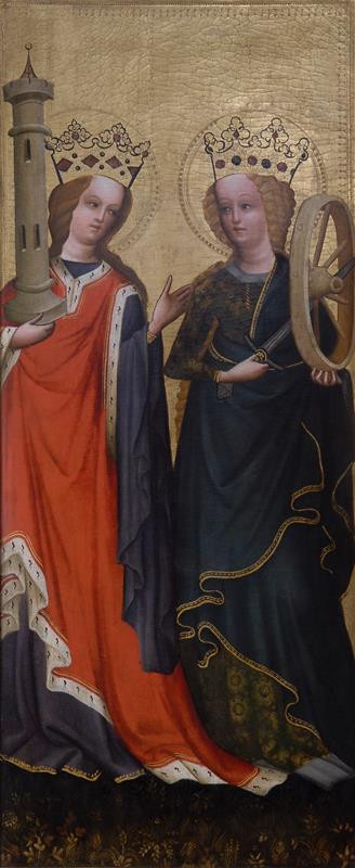 Obe svätice zobrazil na jednej tabuli neznámy rakúsky maliar okolo roku 1430. Svätá Barbora je odetá do spodných modrých šiat so širokými rukávmi a jemnou zlatou výšivkou. Ako vrchný odev má hermelínom lemovaný surcotte červenej farby s hlbokými prieramkami, ktorý je typický pre toto obdobie. Svätá Katarína s kolesom a mečom má vypasovaný cotte zo zeleného brokátu lemovaný sivou kožušinou. Aranžovaný modrý plášť symbolizujúci nebo má ozdobený jednoduchou zlatou geometrickou výšivkou.